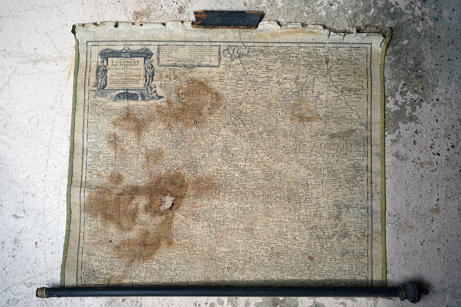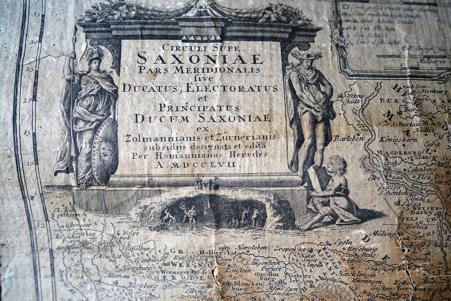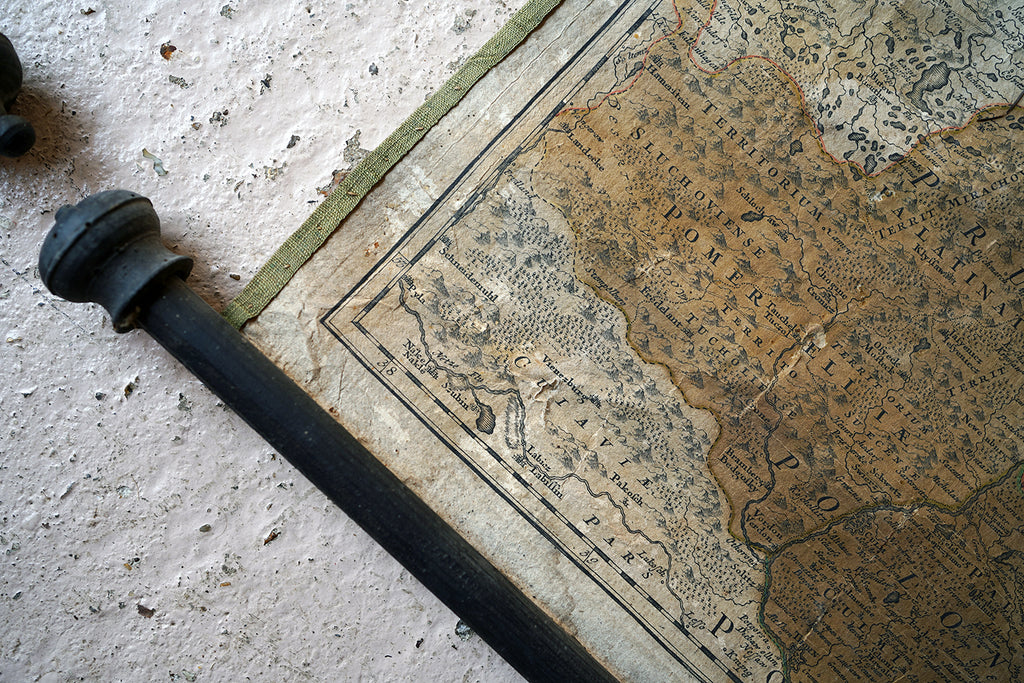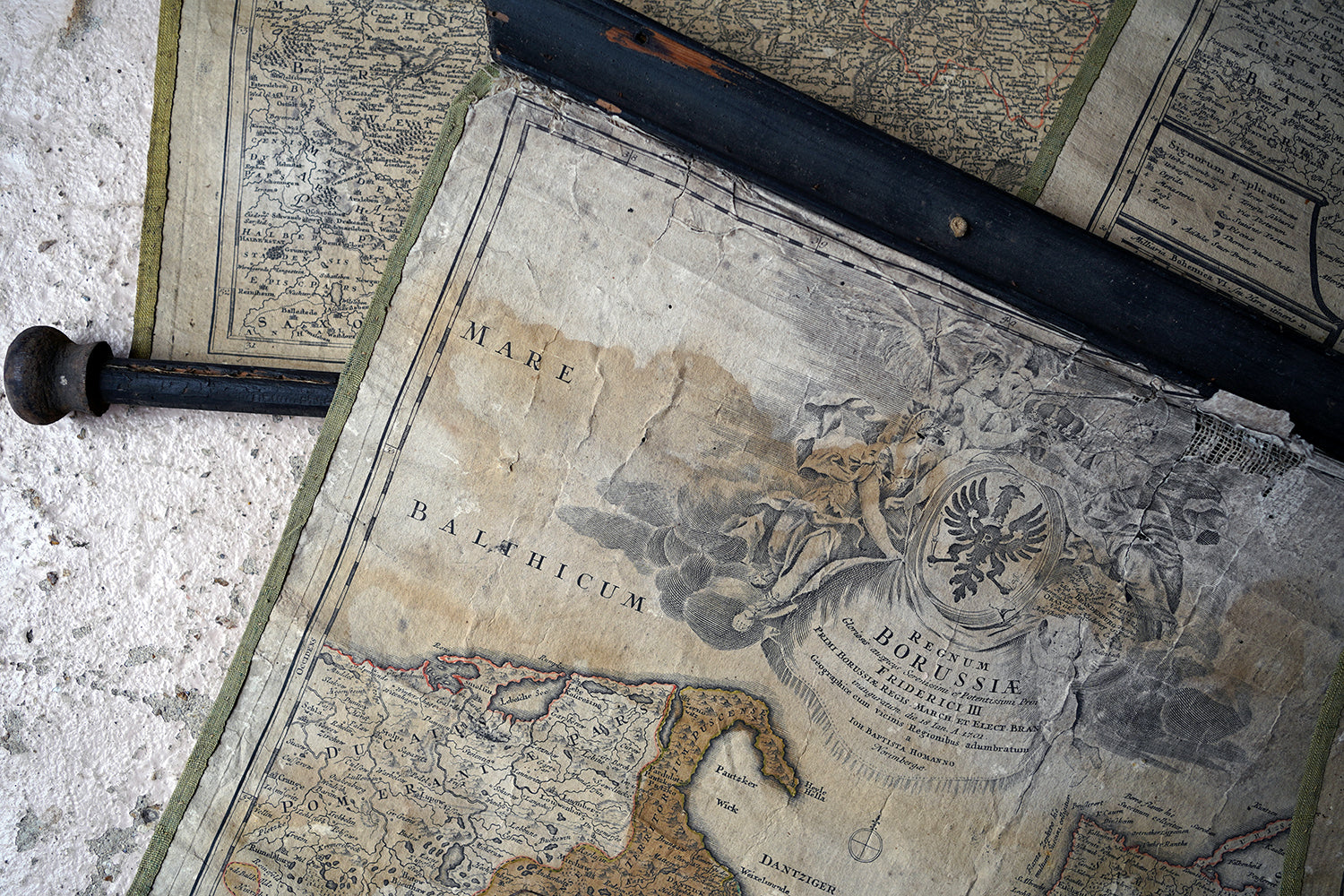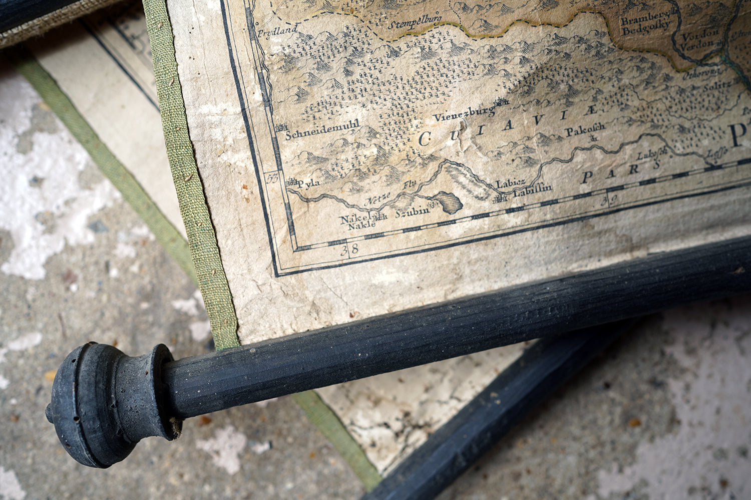The hand-coloured maps in as found attic condition, each with their original ebonised pine rods for scrolling and lime green borders, in beautifully faded order showing various regions from Bohemia, Saxony and the Baltics with beautiful illustrated cartouches, each dating from 1720 to 1757 and being canvas backed,