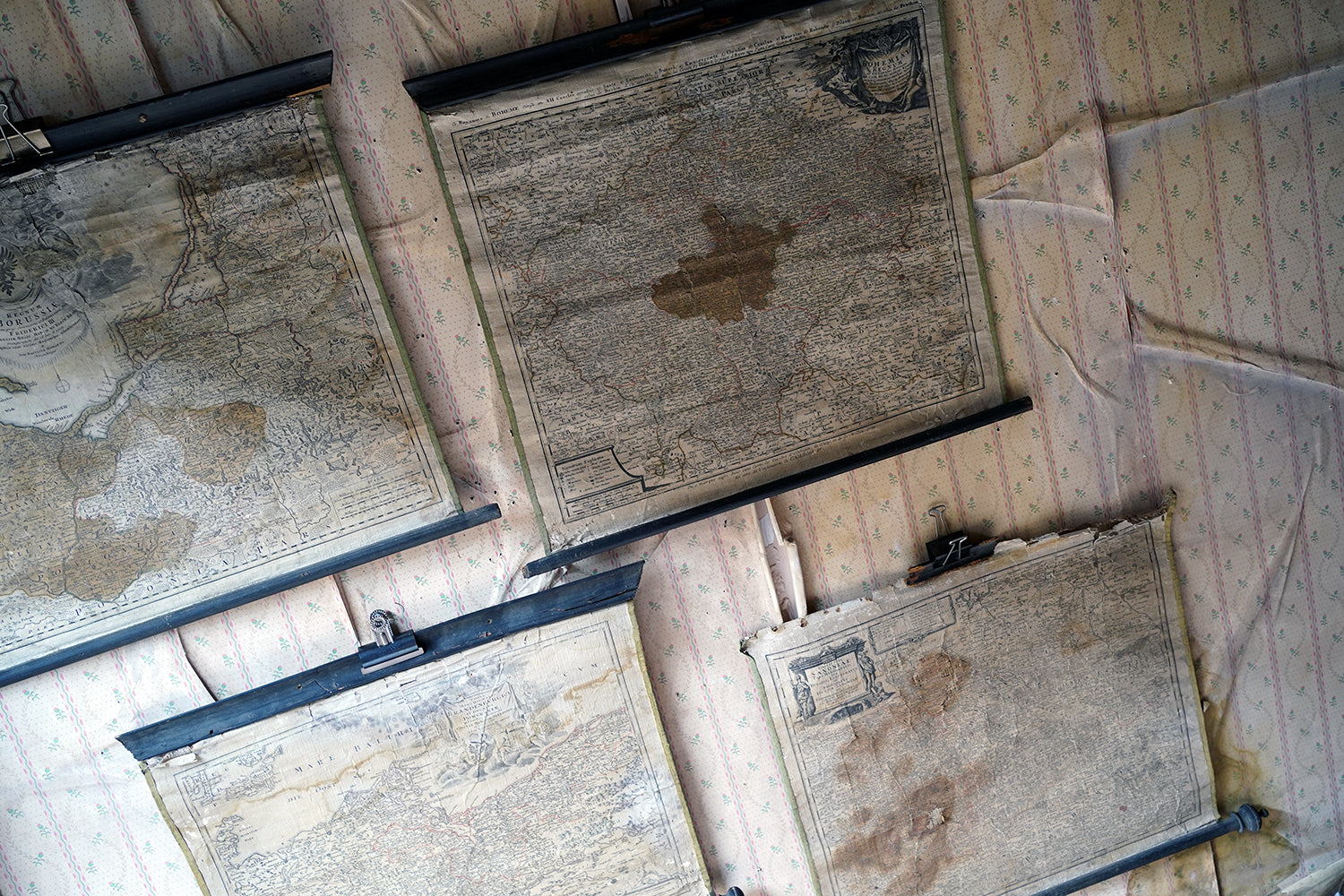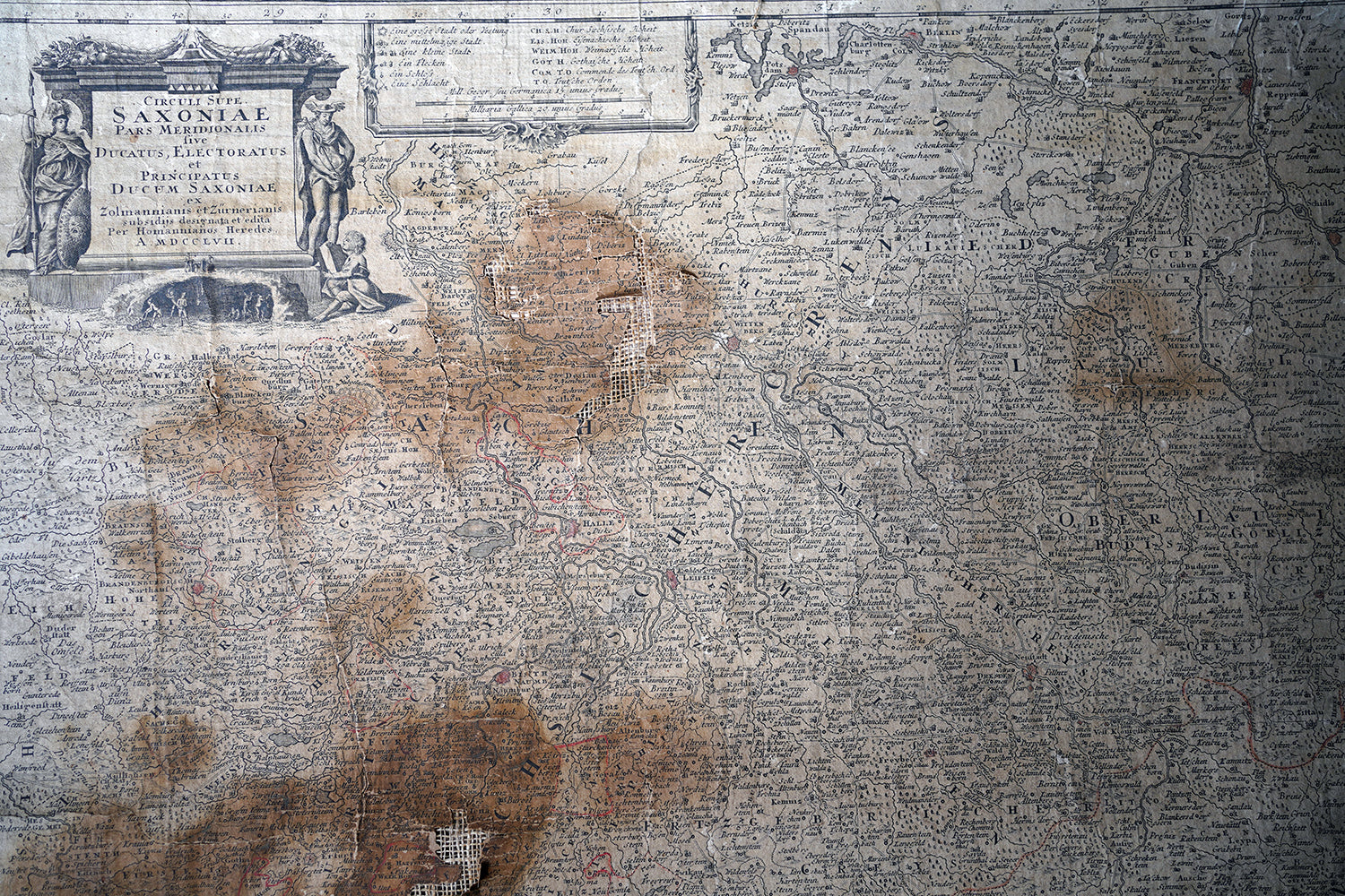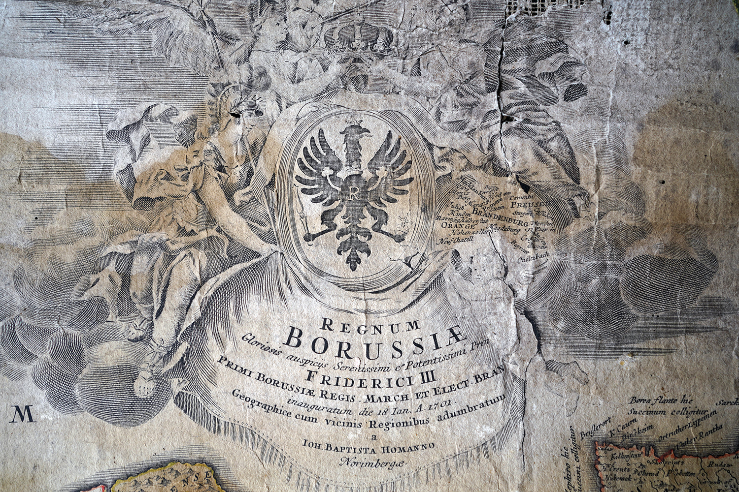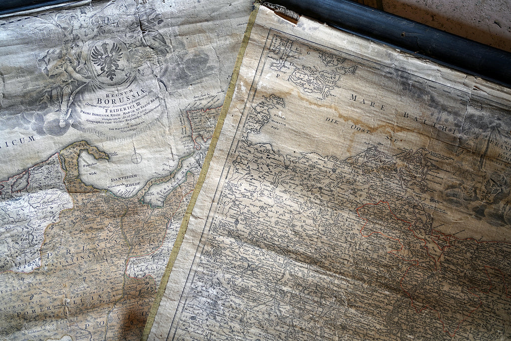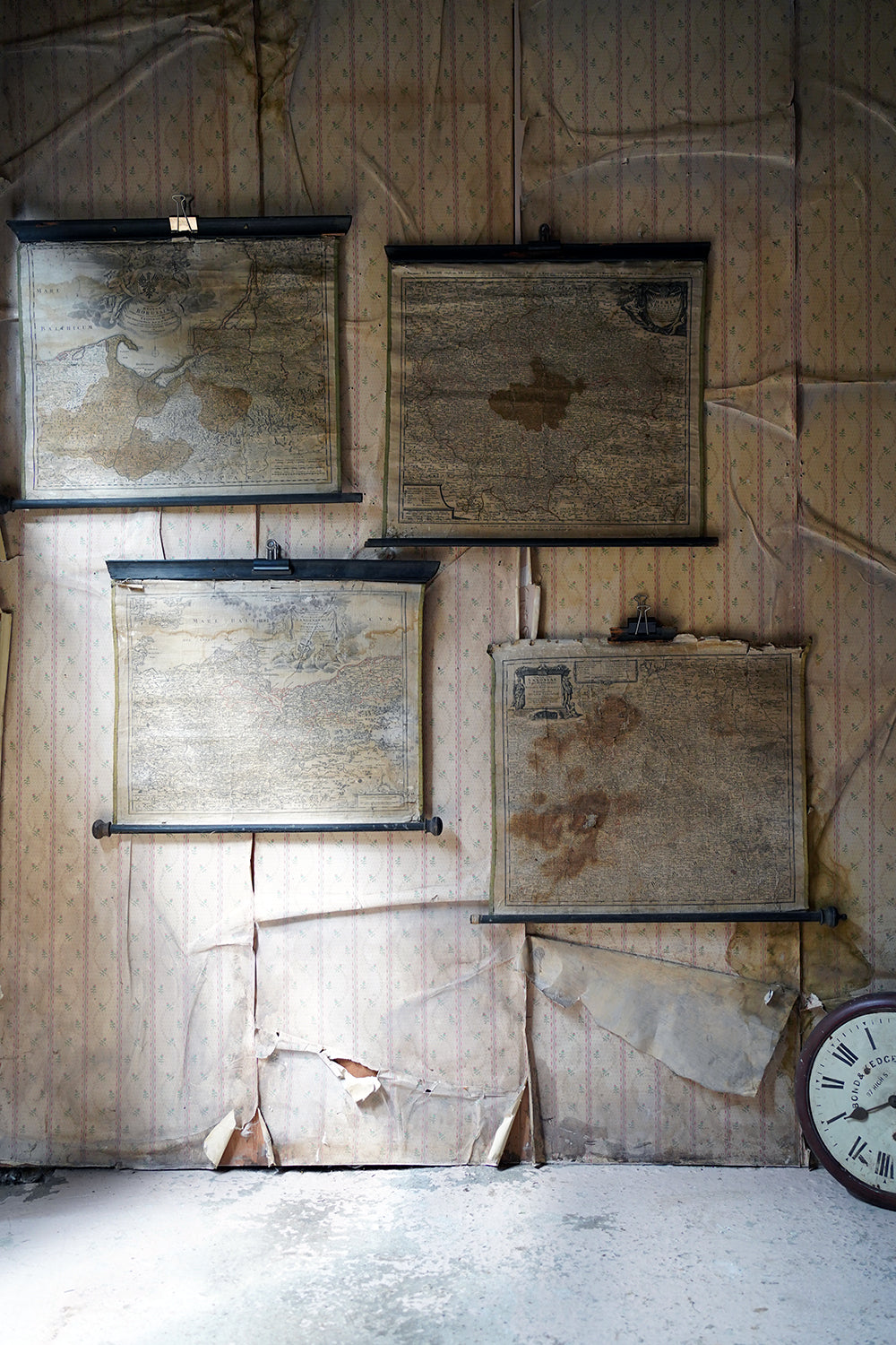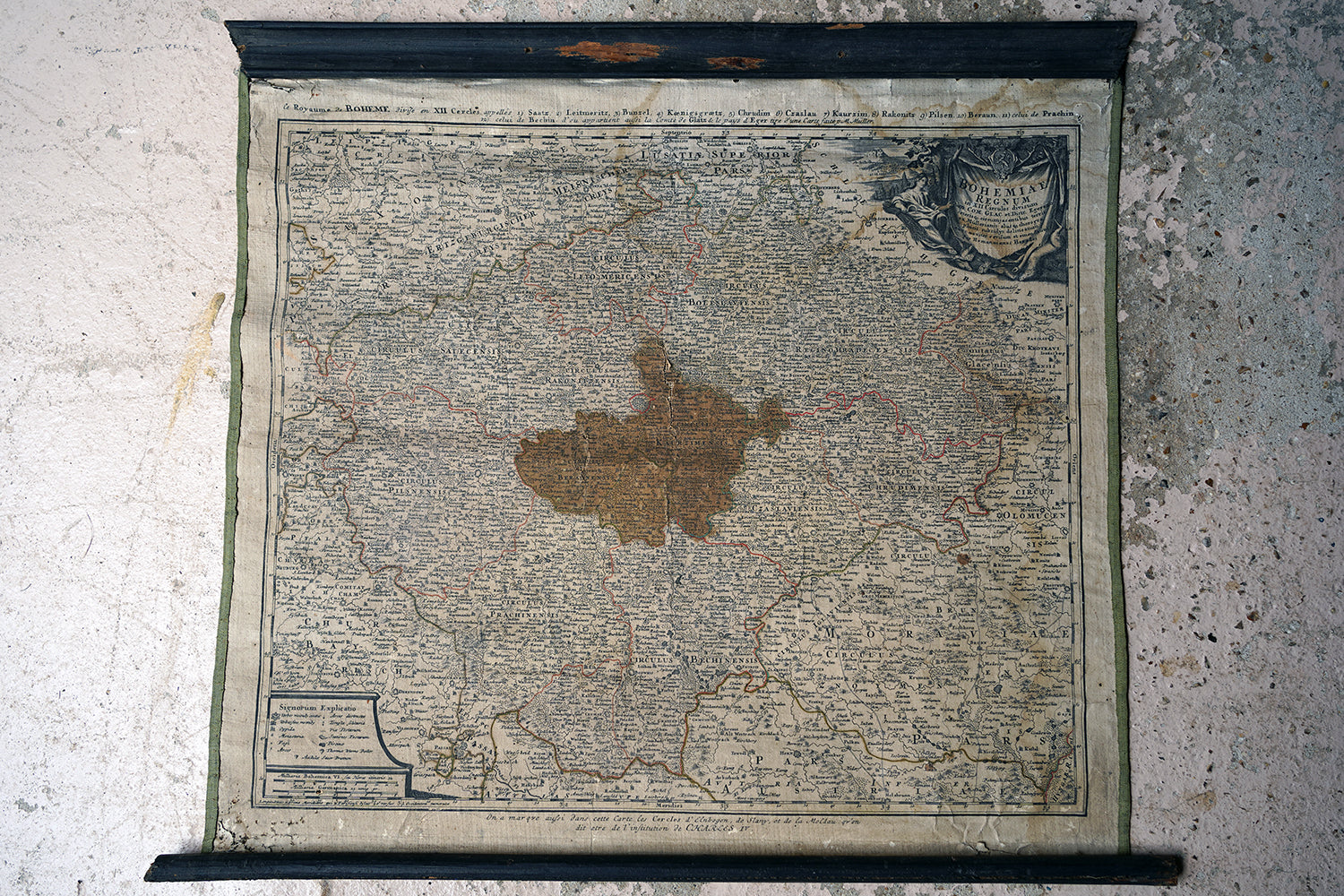 The hand-coloured maps in as found attic condition, each with their original ebonised pine rods for scrolling and lime green borders, in beautifully faded order showing various regions from Bohemia, Saxony and the Baltics with beautiful illustrated cartouches, each dating from 1720 to 1757 and being canvas backed,