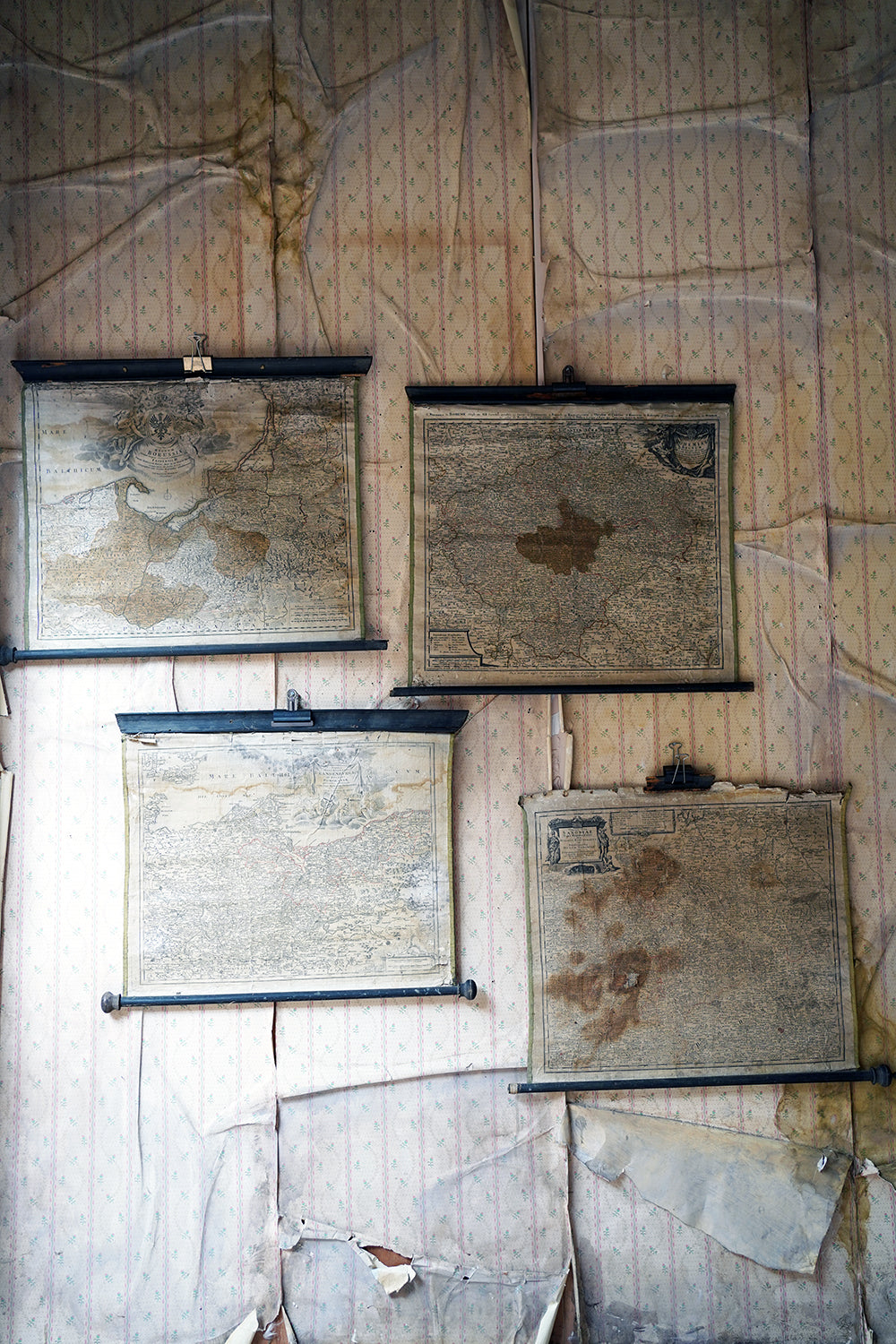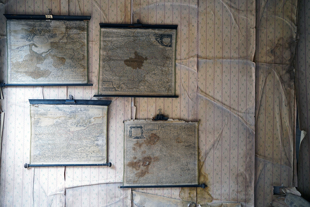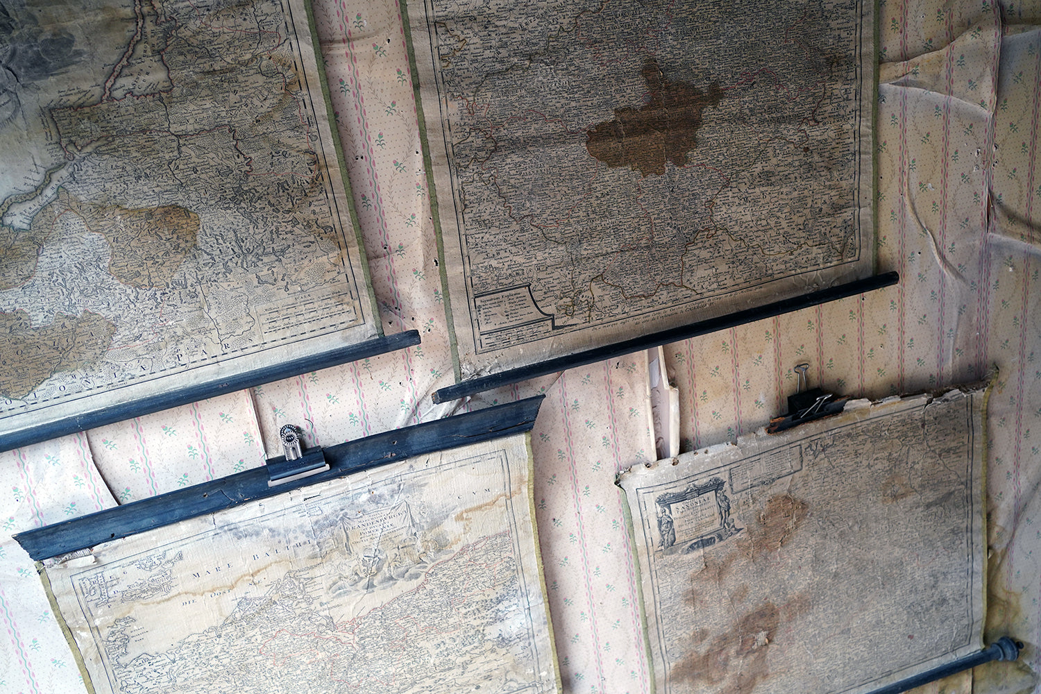 The maps are stained with small tears and sunlight fade. There is staining and soiling and minor crinkles with some folds as issued. General age-related toning and/or occasional minor defects from handling. We cannot find any others similar with the original wooden scrolling poles. One of these is in fragmentary condition to the top as photographed.