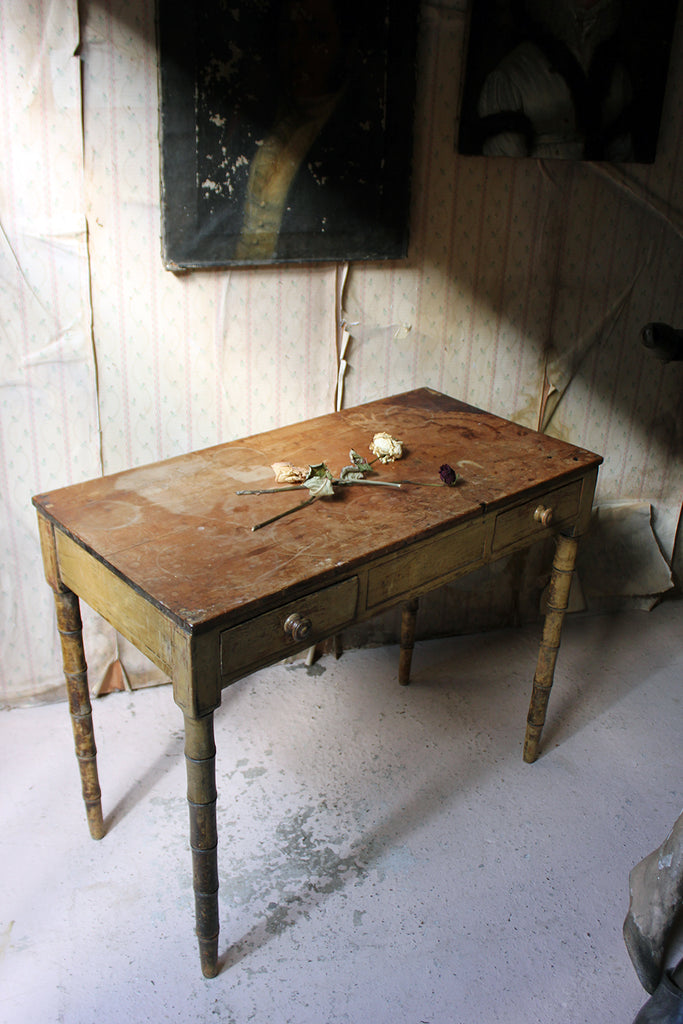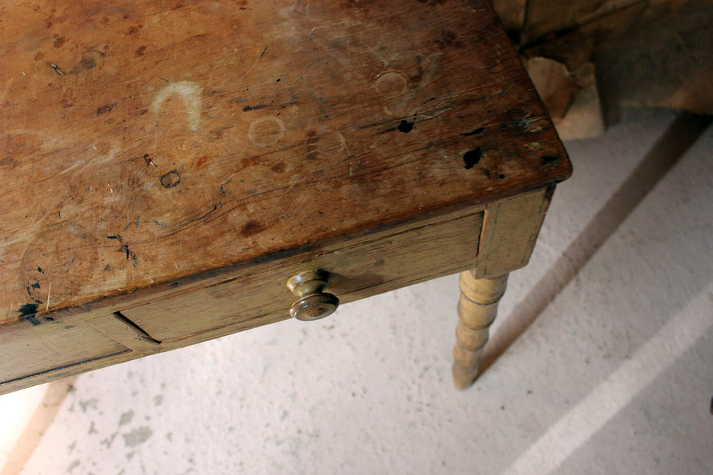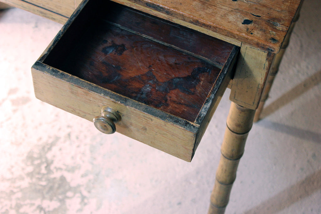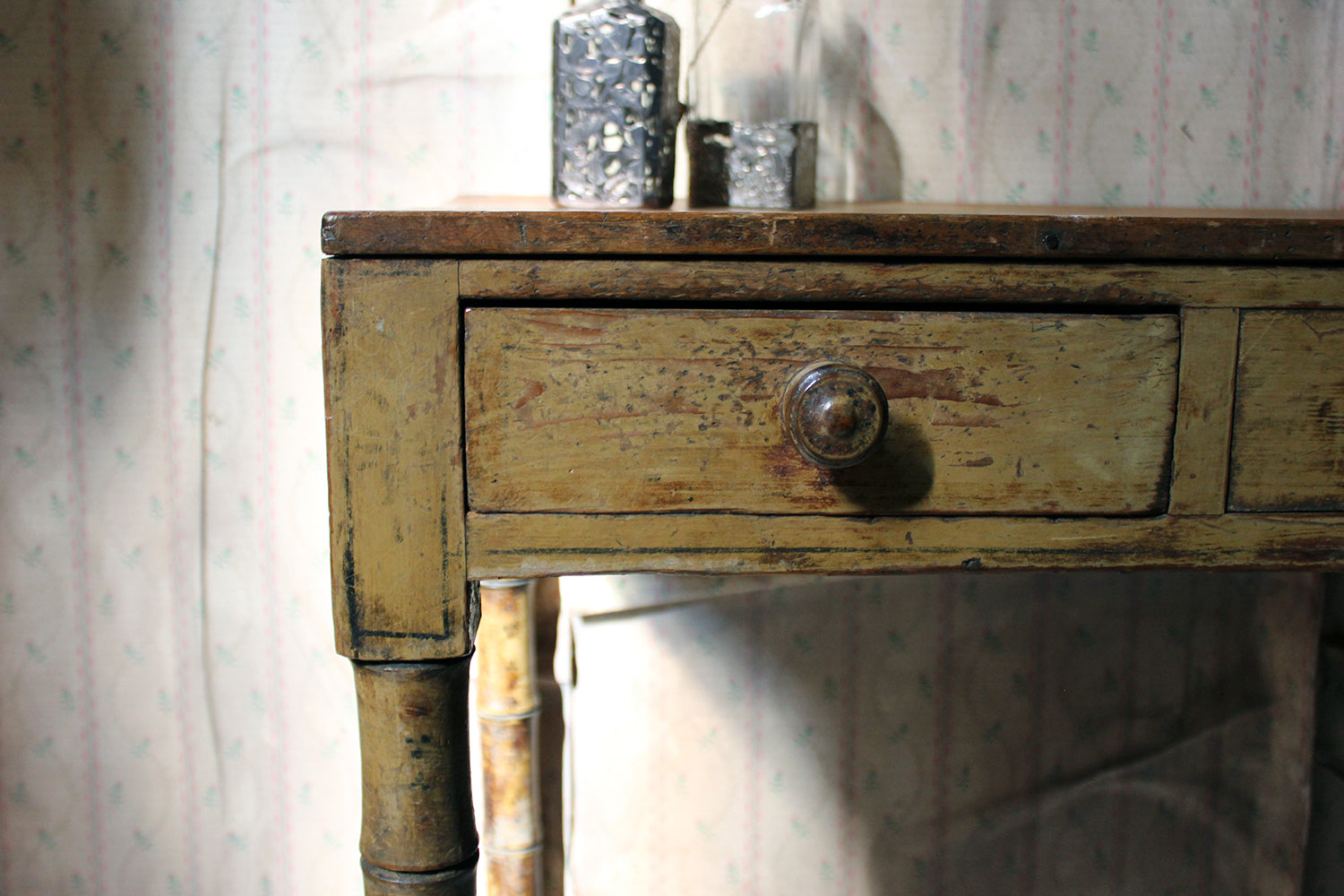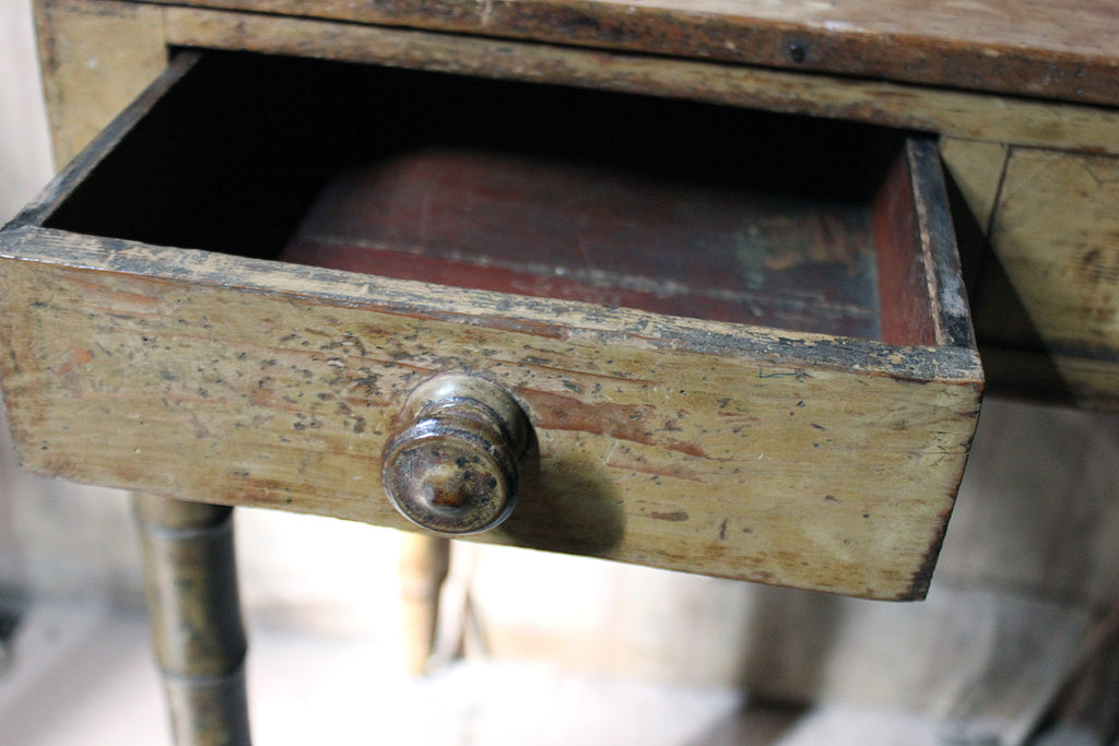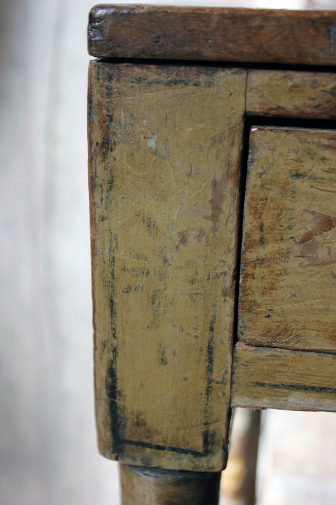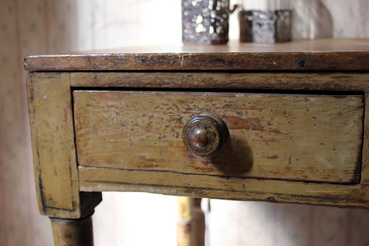The table shows a consistent amount of wear to its original paintwork and proves beautifully decorative. The top now is largely absent of any paint, having ring marks and stains as per the photographs; with the drawers running smoothly and the carcass standing well.
