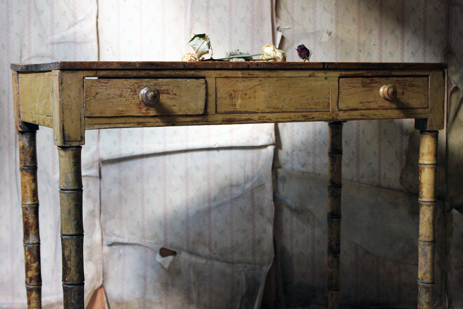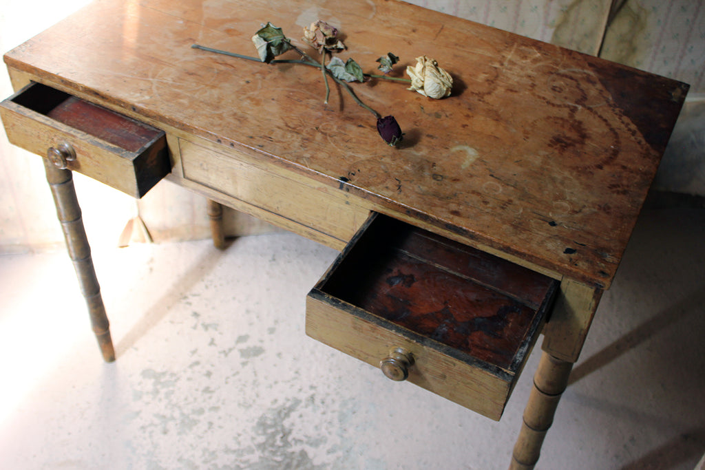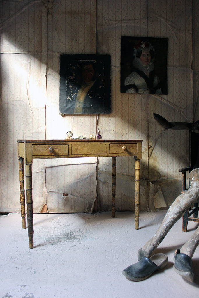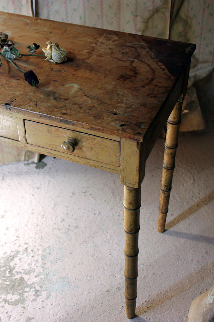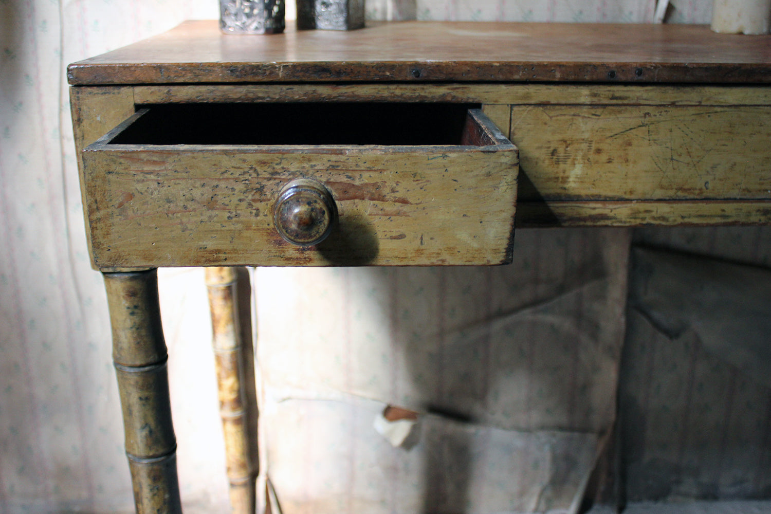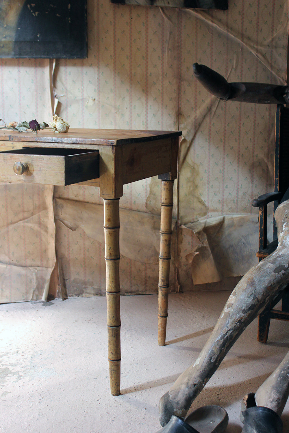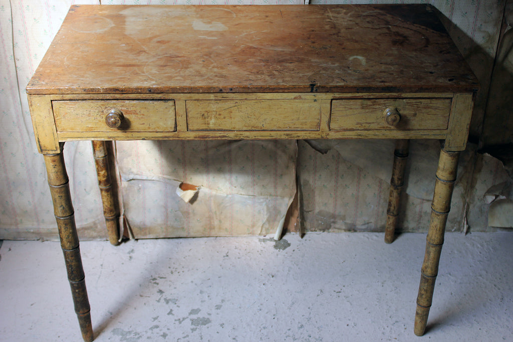 The table shows a consistent amount of wear to its original paintwork and proves beautifully decorative. The top now is largely absent of any paint, having ring marks and stains as per the photographs; with the drawers running smoothly and the carcass standing well.