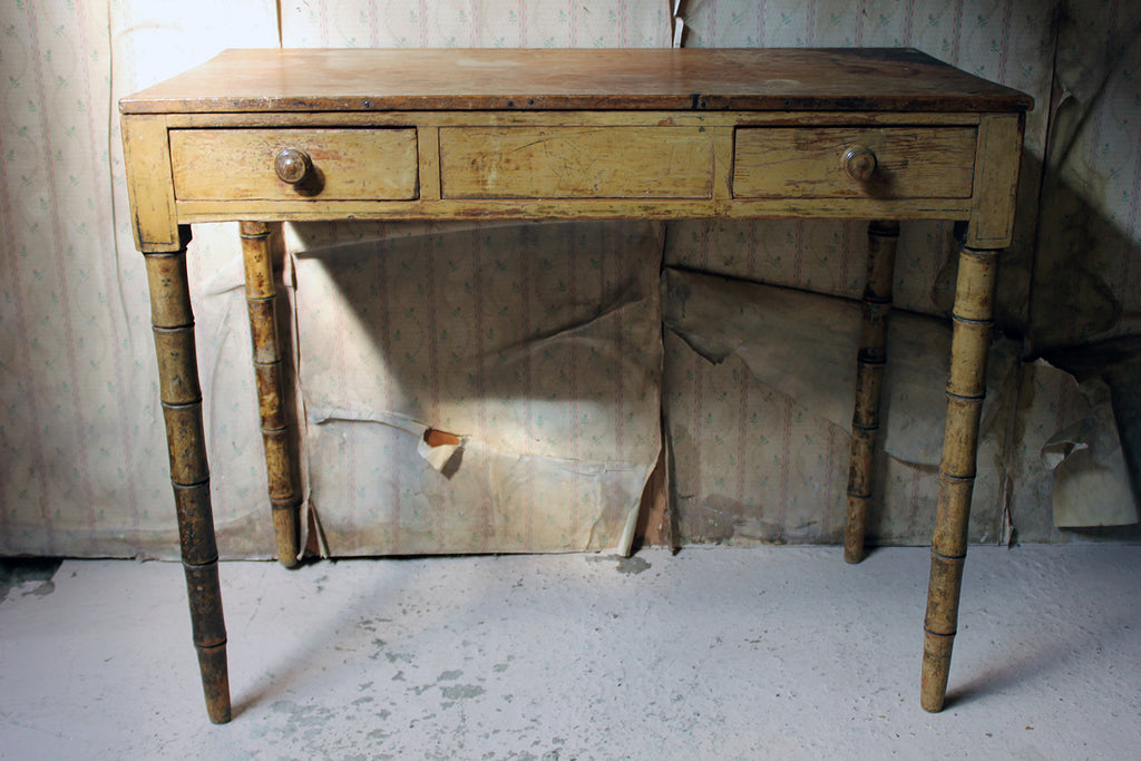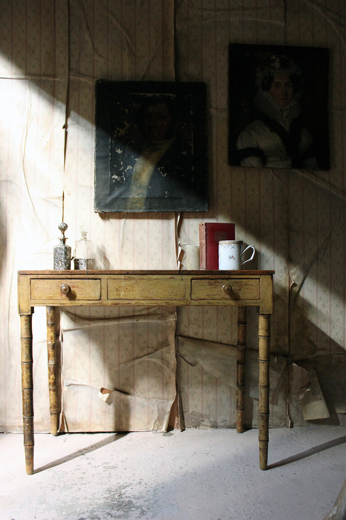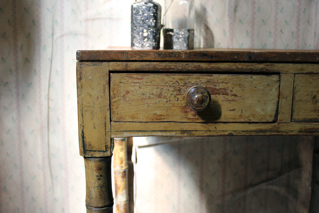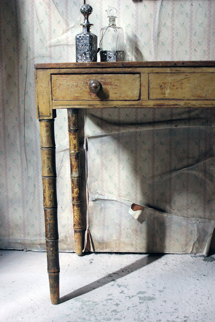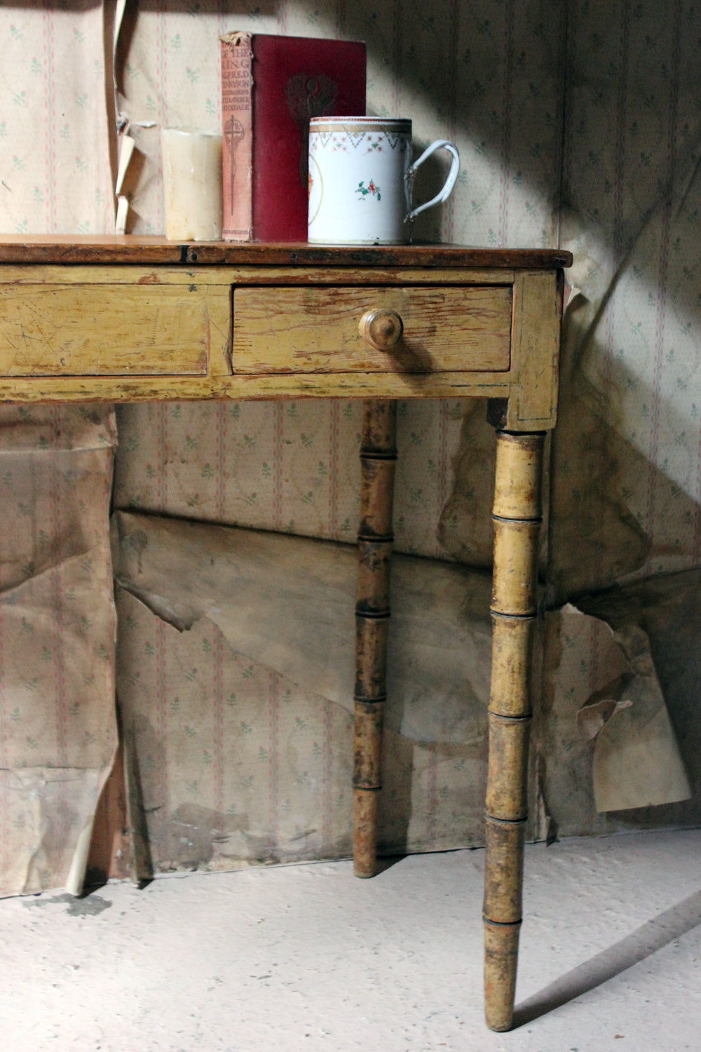 The decorative early-nineteenth century lemon painted bamboo simulated side table showing the original painted finish with line and dot decoration, now distressed commensurate with age, having two frieze drawers to one central dummy, with their original turned handles, to tapering simulated bamboo supports of typical Regency design, the whole surviving from the first quarter of nineteenth century England.