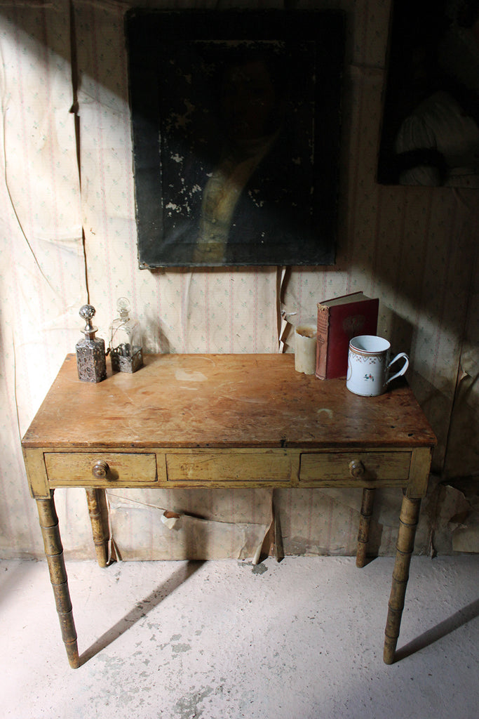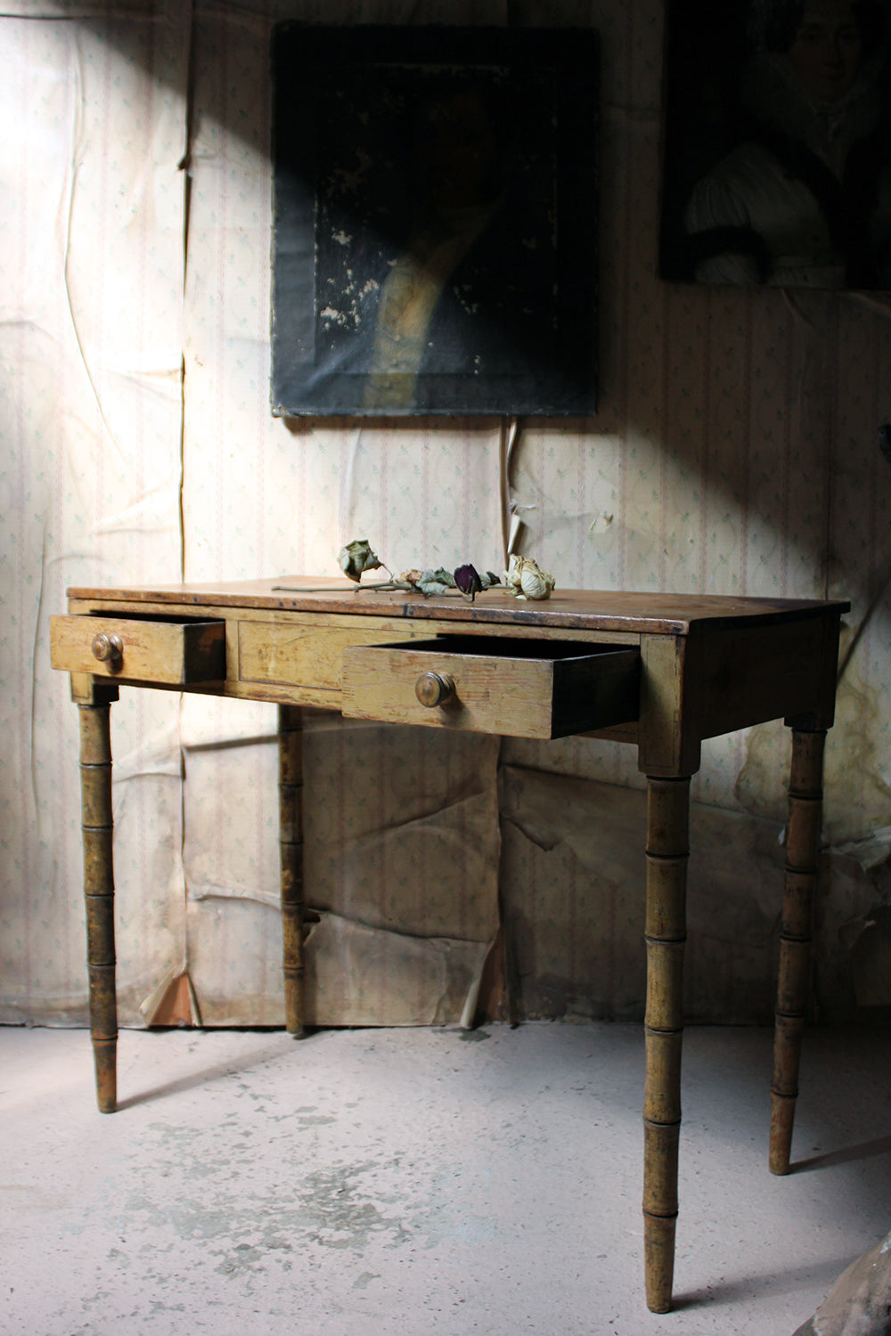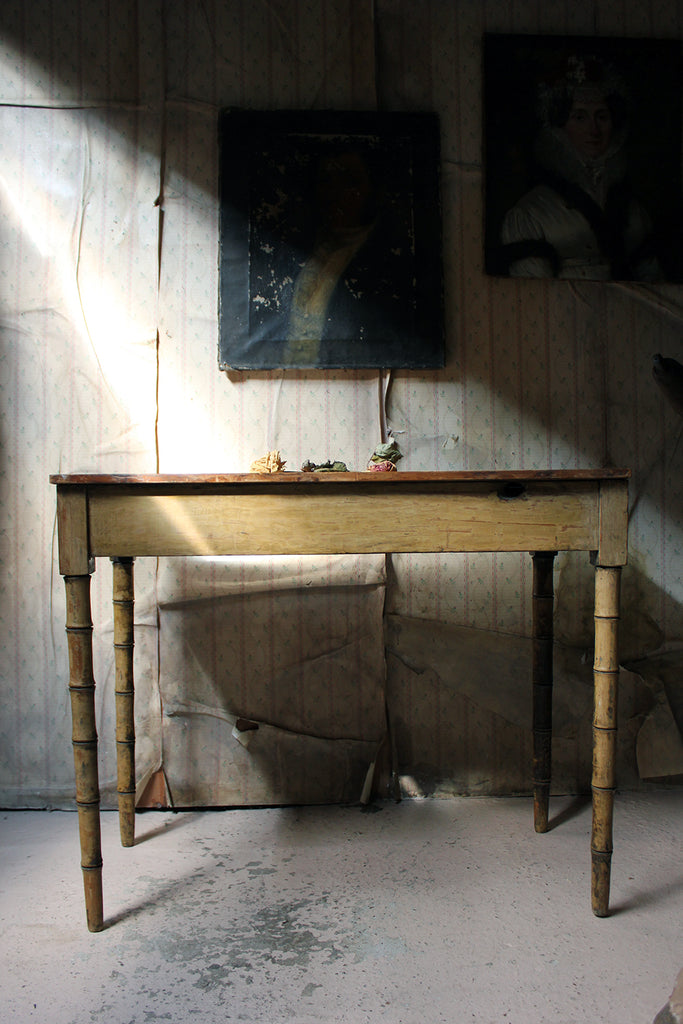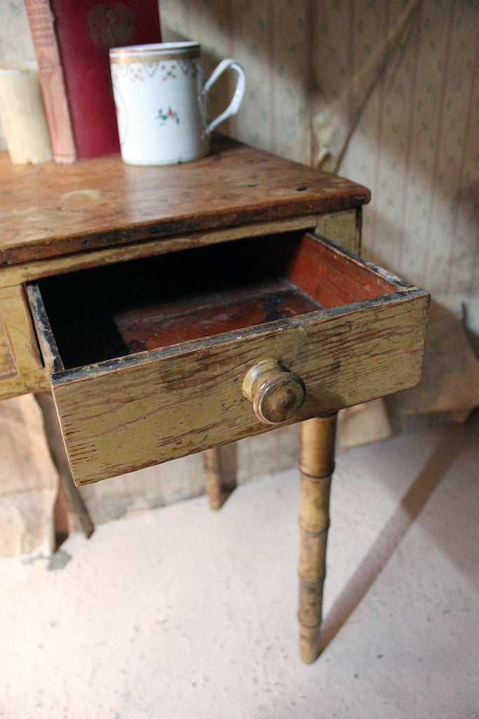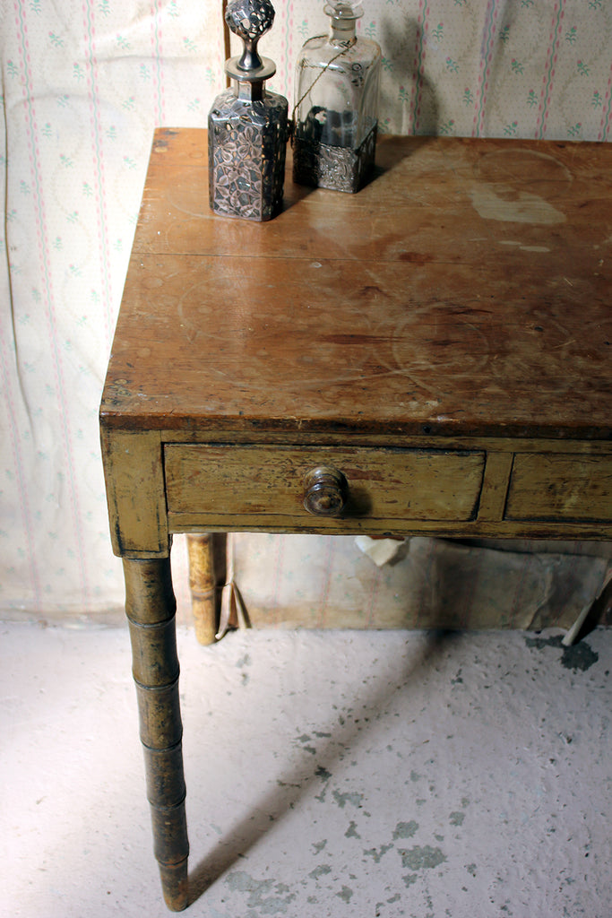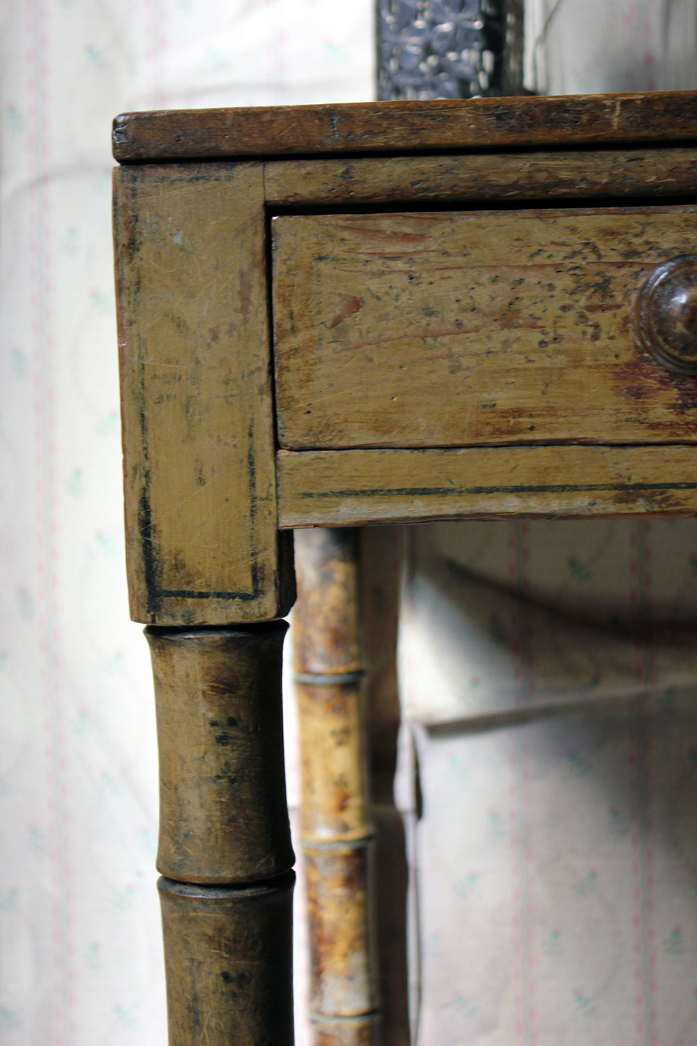 The decorative early-nineteenth century lemon painted bamboo simulated side table showing the original painted finish with line and dot decoration, now distressed commensurate with age, having two frieze drawers to one central dummy, with their original turned handles, to tapering simulated bamboo supports of typical Regency design, the whole surviving from the first quarter of nineteenth century England.